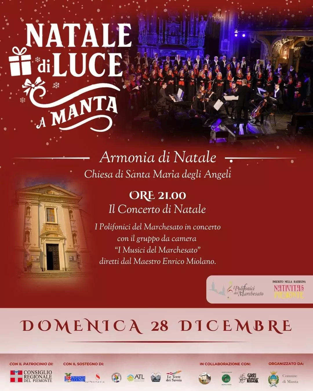 Descrizione ARMONIA DI NATALE IL CONCERTO DI NATALE Chiesa Santa Maria del Angeli Manta 28/12/2025 ore 21,00 I Polifonici del Marchesato in concerto con il gruppo da camera "I Musici del Marchesato" diretti dal Maestro Enrico Miolano.