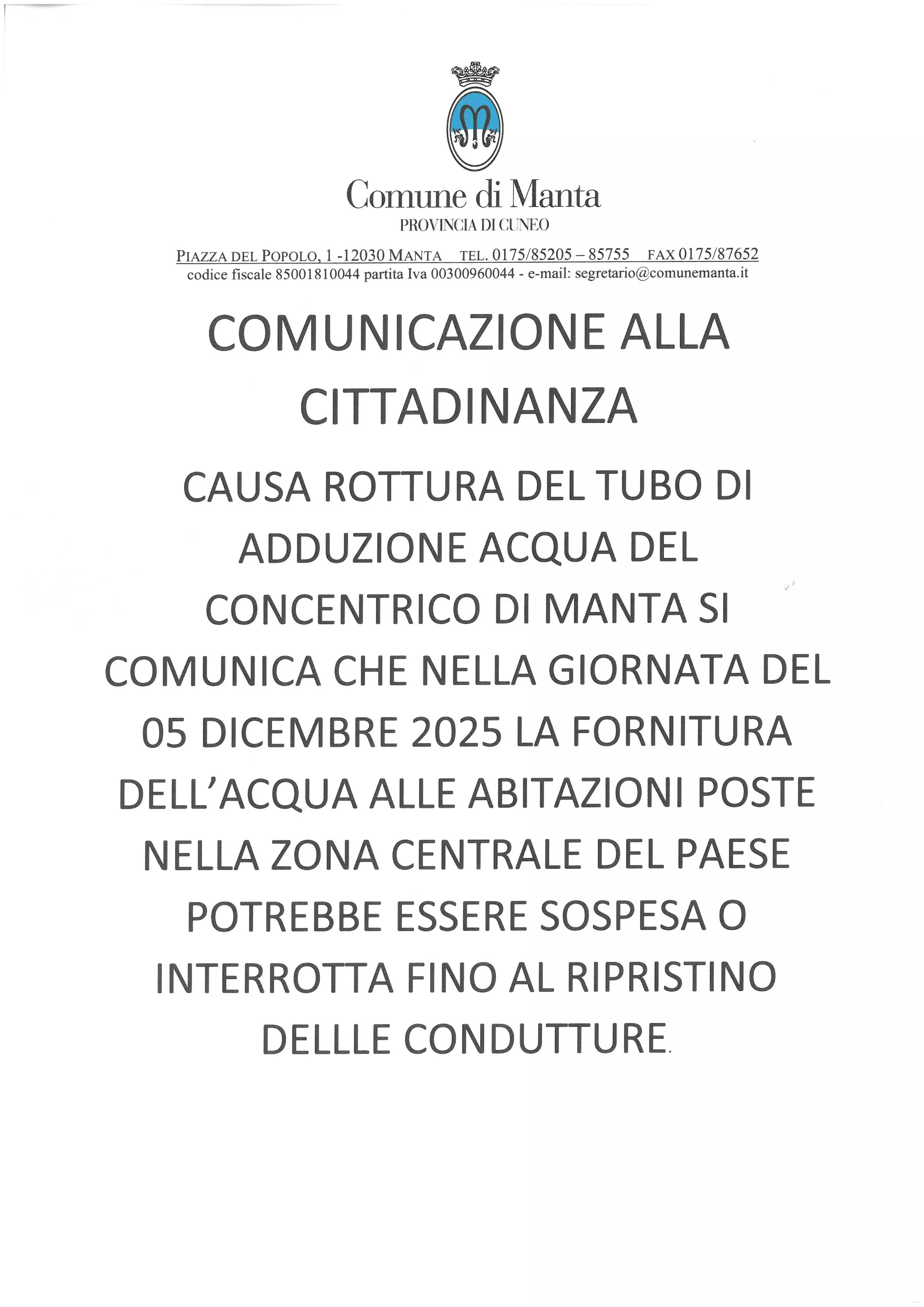 Si comunica che, causa rottura del tubo di adduzione acqua del concentrico di Manta, nella giornata odierna 5 dicembre 2025 la fornitura dell'acqua potabile alle abitazioni poste nella zona centrale del paese potrebbe essere sospesa o interrrotta fino al ripristino delle condutture.